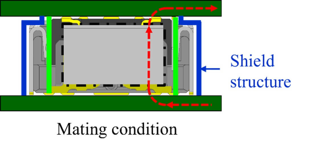 コネクタ本体と嵌合部を金属シェルで覆うフルシールド構造により、ノイズの侵入・漏洩を最大限に抑制し、EMI特性を向上させます(図1)。嵌合時には二重シールド構造となり、電気信号回路はシールドを通過するため、ノイズの発生を抑制します(図2)。