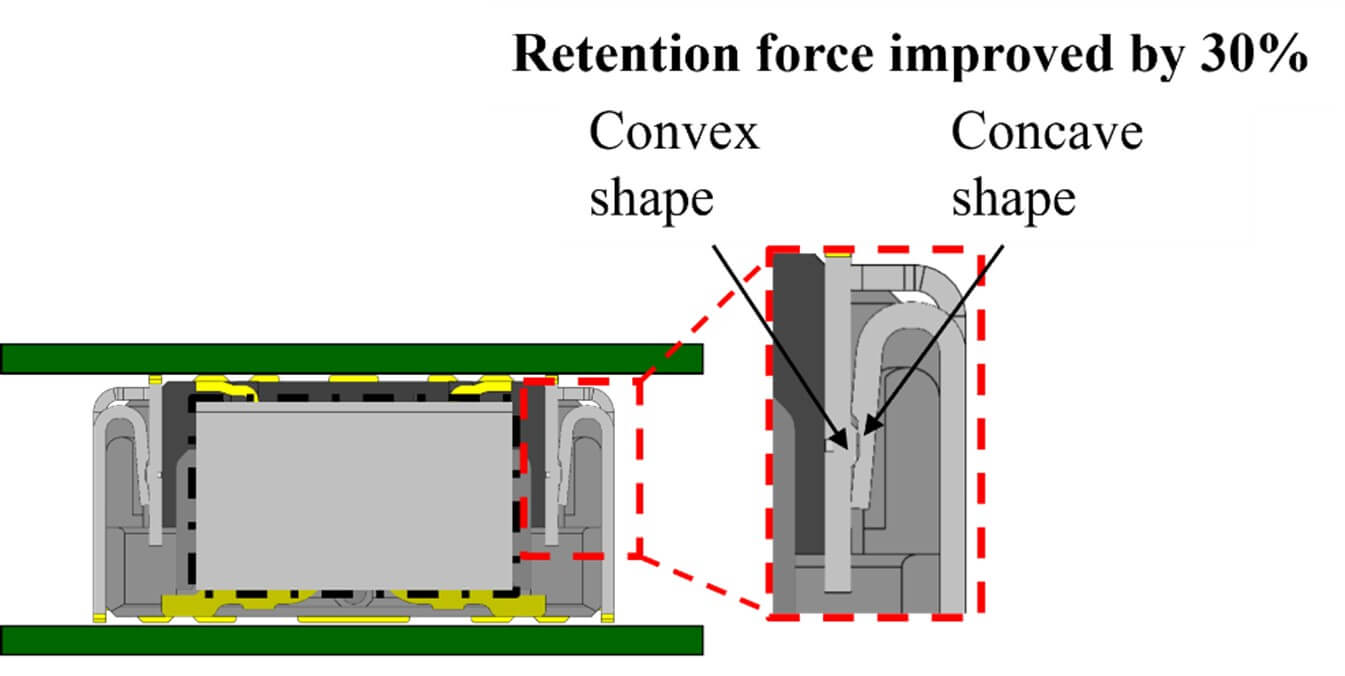 プラグは凸型、レセプタクルは凹型の形状を採用することで、確実な嵌合を実現するロック構造を実現し、従来品比で保持力を30%向上させました。また、プラグとレセプタクルはR形状を採用することで、組み立てやすさと作業性を向上させています。